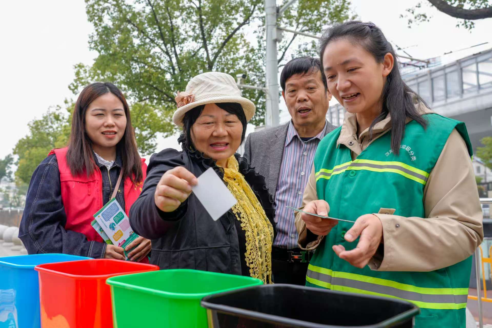活动现场围绕垃圾分类主题打造了沉浸式宣传氛围。入口处的主题展板图文并茂,清晰呈现垃圾分类的重要意义,吸引不少游客驻足了解。工作人员穿梭在赏菊人群中,向市民发放《武汉市生活垃圾分类操作指导》手册,细致讲解可回收物、有害垃圾、厨余垃圾、其他垃圾的分类标准,针对日常生活中易混淆的分类难题进行现场答疑,帮助市民理清分类思路。